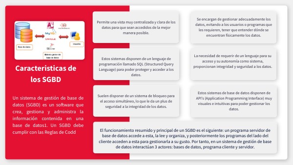 Un sistema de gestión de base de datos (SGBD) es un software que crea, gestiona y administra la información contenida en una base de datos1. Un SGBD debe cumplir con las Reglas de Codd