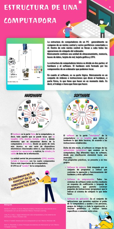 La estructura de computadores de un PC generalmente se compone de un núcleo central y varios periféricos conectados a él. Dentro de este núcleo central se llevan a cabo todas las operaciones de cómputo del ordenador. Básicamente contiene una unidad de almacenamiento, memoria, buses de datos, tarjeta de red, tarjeta gráfica y CPU. La estructura de computadores básica se divide en dos partes: el hardware y el software. El hardware está formado por los componentes de un ordenador que podemos tocar. En cuanto al software, es su parte lógica. Básicamente es un conjunto de órdenes e instrucciones que dicen al hardware, o parte física, lo que tiene que hacer en un momento dado. Es decir, el trabajo o tarea que tiene que hacer.