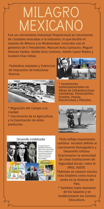 Fue un crecimiento Industrial Proporcional al crecimiento de ciudades enocadas a la Industria, lo que facilito el transito de México a la Modernidad. Coincidio con el gobierno de 5 Presidentes: Manuel Avila Camacho, Miguel Aleman Valdes, Adolfo Ruiz Cortinez, Adolfo Lopez Mateo y Gustavo Diaz Ordaz.