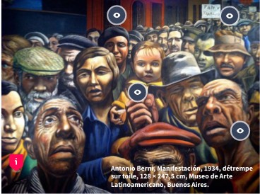 En brief, Antonio Berni était un peintre argentin qui a été profondement influencé par la crise de 1929 en Amérique Latine. Il a créé plusieurs oeuvres d'art qui reflètent les conséquences sociales et économiques de la crise sur la population. Son oeuvre "manifestation" de 1934. Cette peinture représente une foule de travailleurs en colère protestant contre les conditions économiques difficiles et à la perte de leur emploi. Ce peintre utilise des couleurs vives afin d'attirer notre attention sur son message, puis des formes corporelles assez fades ain d'exprimer la frustation et le ressenti de ces travailleurs. Son oeuvre reflète la réalité sociale et économique de l'Amérique latine pendant la crise de 1929. Elle met en évidence les inégalités sociales, la pauvreté et la lutte constante des travailleurs pour survivre. Il dénonce alors les injustces afin de donner une possibilité à ces travailleurs une chance de s'en sortir. J'ai choisi cet oeuvre pour des raisons personnelles qui m'ont atteintes.! Après avoir chercher longuement une photo qui pouvait correspondance au sujet, je ne trouvais pas de photo dans laquelle j'y étais attachée. Les photos en noir et blanc ne permettaient pas d'élaborer la nuance des couleurs, par ailleurs j'ai élaboré des rehcerches suplémentaires et je suis tombée sur celle-ci et de nombreuses oeuvres de cette artiste pour lequel j'y étais rattaché comme "Juanito va à l'école" (1957-1958). Enfin l'oeuvre choisi m'a particuièrement touché, sur le faite que je me suis mise à la place de ces latinos, et j'ai pu ressentir leur tristesse à travers l'écran. Surtout lorsque j'ai visionné cette jeune fille placée au centre, je me suis demandé comment s'en sortaient-ils sans vivres où du moins très peu ? Ces divers personnes m'ont marqués suite à leur exprerssion de leurs visages qui démontrent, tristesses, colère ou encore espoir.