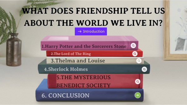 With all the extracts we saw, we can now answer the key question, which is What does friendship tell us about the world we live on? We saw with harry potter and The Lord of the ring that in even violent and complicated situation that we could live now, friendship is even stronger. Then with Thelma and Louise, we saw that their friendship could be nice and happy but contains also hard parts such as arguments. Finally, we saw with the mysterious benedict society that friendship is not a simple thing and can evolve in diverse ways. To put in a nutshell, we discovered that English speaking culture present several forms of friendship, allowing each one to create his own definition.