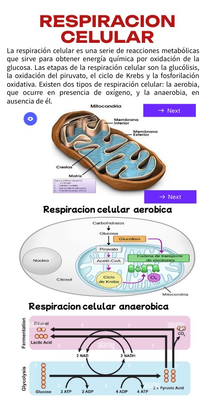 La respiración celular es una serie de reacciones metabólicas que sirve para obtener energía química por oxidación de la glucosa. Las etapas de la respiración celular son la glucólisis, la oxidación del piruvato, el ciclo de Krebs y la fosforilación oxidativa. Existen dos tipos de respiración celular: la aerobia, que ocurre en presencia de oxígeno, y la anaerobia, en ausencia de él.