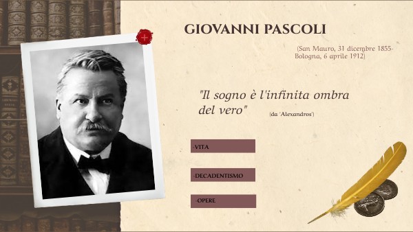 Giovanni Pascoli fu uno dei principali e importanti autori della letteratura italiana.Fu un poeta decadente pessimista, infatti la sua vita fu caratterizzata dal dolore e dal male. I temi principali presenti nelle poesie di Pascoli sono la natura, la vita contadina, la morte e il mito. Egli nacque a San Mauro di Romagna nel 1862, da una famiglia della piccola borghesia rurale. Il padre era l’amministratore di un'azienda agricola di proprietà dei principi di Torlonia. La sua vita, però, fu segnata da un tragico evento, ovvero la morte del padre Ruggero che fu ucciso a fucilate. La famiglia si trovò ad affrontare forti difficoltà economiche, così Giovanni, che sin dal 1862 era entrato a far parte in un collegio ad Urbino, dove ricevette una formazione classica, fu costretto nel 1971 ad abbandonarlo. Questo evento segnò per sempre la vita del giovane Pascoli, ed influenzò inevitabilmente tutta la sua produzione, infatti nelle sue poesie proporrà in maniera molto ricorrente il tema del nido famigliare. successivamente nel 1873 ottenne una borsa di studio presso l’università di Bologna, dove frequentò la facoltà di lettere. Dopo poco tempo morì anche la madre del poeta, e successivamente anche i due fratelli. Egli trascorse quindi la sua vita in compagnia delle sorelle Ida e Maria, stabilendo nel corso del tempo con loro delle relazioni quasi ossessive. All’università conobbe il socialista Andrea Costa, grazie al quale partecipò ai primi moti socialisti. Successivamente prenderà così parte alla manifestazione in difesa di Gaetano Bresci, a causa della quale fu incarcerato per tre mesi assieme ad altri anarchici. A causa dell’arresto terminò la sua vita politica e riprese così gli studi accademici, presso l’Università di Bologna, e nel 1882 si laurea. Cominciò così la sua attività di professore, in particolare delle materie letterarie di latino e greco. Riuscì a prendere la cattedra in sostituzione di Carducci, suo mentore. Al termine della sua carriera di insegnante tramite il prosperoso lavoro riuscì a comprare una casa a Castelvecchio dove si trasferì con le sorelle, il poeta, infatti, dopo i lutti, cercò in tutti i modi di ricreare una famiglia unita. Pascoli morì nel 1912 a seguito di un tumore al fegato e allo stomaco.