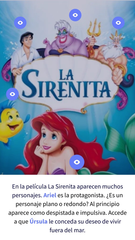 En la película La Sirenita aparecen muchos personajes. Ariel es la protagonista. ¿Es un personaje plano o redondo? Al principio aparece como despistada e impulsiva. Accede a que Úrsula le conceda su deseo de vivir fuera del mar.