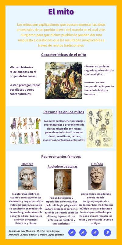 Los mitos suelen tener personajes sobrenaturales o provenientes de ciertas mitologías con rasgos generalmente fantásticos como: dioses, semidioses, héroes, monstruos, fantasmas, entre otros.