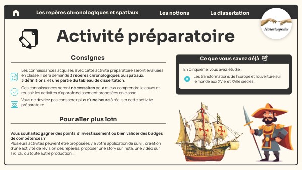 Les connaissances acquises avec cette activité préparatoire seront évaluées en classe. Il sera demandé 5 repères chronologiques ou spatiaux, 5 définitions . Ces connaissances seront nécessaires pour mieux comprendre le cours et réussir les activités d’approfondissement proposées en classe. Vous ne devriez pas consacrer plus d'une heure à réaliser cette activité préparatoire.