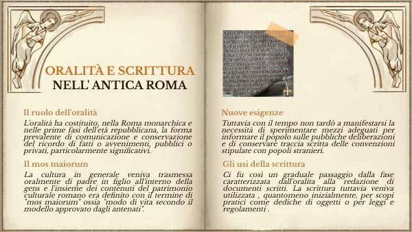 L'oralità ha costituito, nella Roma monarchica e nelle prime fasi dell'età repubblicana, la forma prevalente di comunicazione e conservazione del ricordo di fatti o avvenimenti, pubblici o privati, particolarmente significativi.