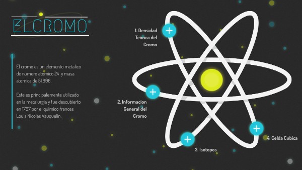 El cromo es un elemento metalico de numero atomico 24 y masa atomica de 51.996. Este es principalemente utilizado en la metalurgia y fue descubierto en 1797 por el quimico frances Louis Nicolas Vauquelin.