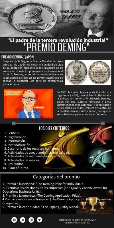 En 1951, la Unión Japonesa de Científicos e Ingenieros (JUSE), creó el Premio Nacional a la Calidad en honor a W. Edwards Deming, quien con sus “Catorce Principios y Siete Enfermedades de la Gerencia”; y la aplicación de la Estadística en las Técnicas de Control de la Calidad sacó adelante a Japón, país que se encontraba en grave situación económica.