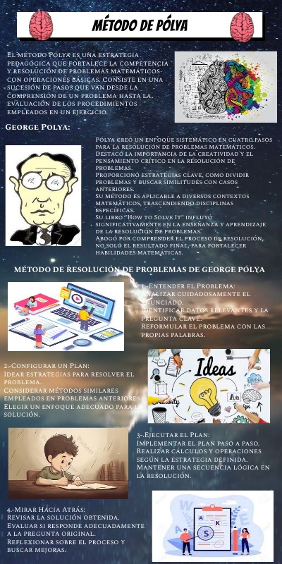 El método Pólya es una estrategia pedagógica que fortalece la competencia y resolución de problemas matemáticos con operaciones básicas. Consiste en una sucesión de pasos que van desde la comprensión de un problema hasta la evaluación de los procedimientos empleados en un ejercicio.