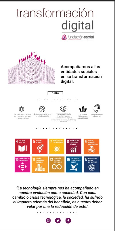 Desde Fundaciópn Esplai Ciudadanía Comprometida, venimos defendiendo y trabajando por la capacitación y el desarrollo digital del tercer sector como motor de empoderamiento de la ciudadanía. La revolución digital y tecnológica suponinedo un gran avance social también es fuente de nuevas desigualdades en las que el tercer sector debe trabajar.