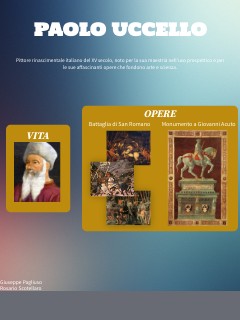 Paolo Uccello è stato un pittore italiano del XV secolo, nato intorno al 1397 a Pratovecchio, in Toscana, e morto nel 1475 a Firenze. Il suo vero nome era Paolo di Dono, ma è noto principalmente con il soprannome "Uccello", dato forse per la sua passione per gli uccelli. Paolo Uccello è noto per essere stato uno dei primi artisti che faceva uso della prospettiva nel Rinascimento italiano. La sua opera più celebre è la serie di affreschi dedicati alla Battaglia di San Romano, realizzata tra il 1438 e il 1440, che dimostra la sua abilità nel rappresentare dettagliatamente le figure umane e gli elementi architettonici in prospettiva lineare.