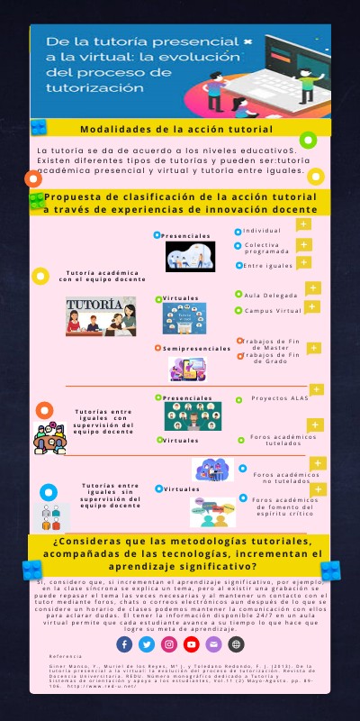 Referencia Giner Manso, Y., Muriel de los Reyes, Mª J. y Toledano Redondo, F. J. (2013). De la tutoría presencial a la virtual: la evolución del proceso de tutorización. Revista de Docencia Universitaria. REDU. Número monográfico dedicado a Tutoría y Sistemas de orientación y apoyo a los estudiantes, Vol.11 (2) Mayo-Agosto. pp. 89- 106. http://www.red-u.net/
