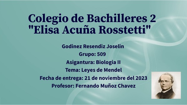 Godinez Resendiz Joselin Grupo: 509 Asigantura: Biologia II Tema: Leyes de Mendel Fecha de entrega: 21 de noviembre del 2023Profesor: Fernando Muñoz Chavez