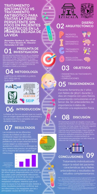 • IMSS. (2013). Diagnóstico y tratamiento de la fiebre sin signos de focalización en los niños de 3 meses hasta los 5 años de edad. CMGPC IMSS-350-13.• Graaf S., Wietske K.M., Pajkrt D., Berend P.F. (2023). Fever without a source in children: international comparison of guidelines. World Journal of Pediatrics; 19: 120-128.• • Rose E. (2021). Pediatric Fever. Emerg Clin N Am; 39: 627-639. • Susanna E. Victoria E., Alberto A. (2018). Approach to neonates and young infants with fever without a source who are at risk of severe bacterial infection; Hindawi. • Rivero C., Dacosta a., Cervantes E. (2023). Síndrome febril prolongado y fiebre de origen desconocido. SEIP; 2: 347-368. • Aparna P., Shravani M. (2019). Profile of fever of unknown origin in children and the role of investigation: an observational study. Journalmof microbiology and infectious diseases; 9(4): 137-143.