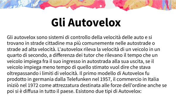 Gli autovelox sono sistemi di controllo della velocità delle auto e si trovano in strade cittadine ma più comunemente nelle autostrade o strade ad alta velocità. L'autovelox rileva la velocità di un veicolo in un quarto di secondo, a differenza dei tutor che rilevano il tempo che un veicolo impiega fra il suo ingresso in autostrada alla sua uscita, se il veicolo impiega meno tempo di quello stimato vuol dire che stava oltrepassando i limiti di velocità. Il primo modello di Autovelox fu prodotto in germania dalla Telefunken nel 1957, il commercio in Italia iniziò nel 1972 come attrezzatura destinata alle forze dell'ordine anche se poi si è diffusa in tutto il paese. Esistono due tipi di Autovelox:
