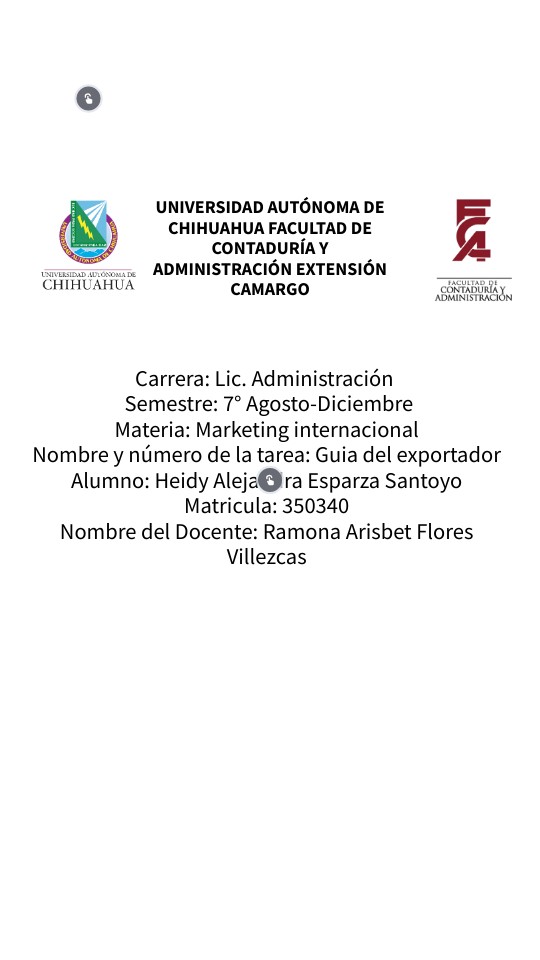 Carrera: Lic. Administración Semestre: 7° Agosto-Diciembre Materia: Marketing internacional Nombre y número de la tarea: Guia del exportador Alumno: Heidy Alejandra Esparza Santoyo Matricula: 350340 Nombre del Docente: Ramona Arisbet Flores Villezcas