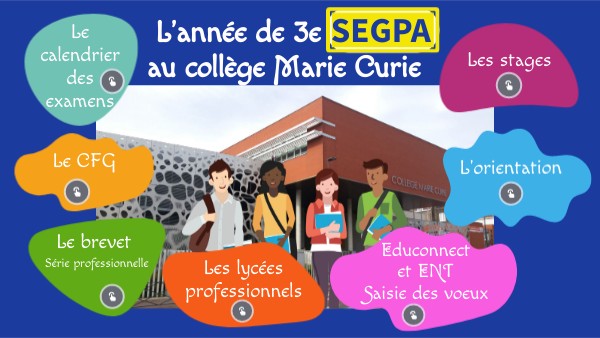 Durant le 1er semestre : • Le Professeur Principal de 3ème SEGPA organise des moments de sensibilisation à l’orientation (séances collectives et entretiens individuels) . Entretiens individuels avec la Psy-EN • Stage en milieu professionnel Durant le 2ème semestre : • Journées portes ouvertes des lycées professionnels (les dates vous seront signalées ultérieurement). . Stage en milieu professionnel • Stages d'immersion en Lycée Professionnel : Chaque LP propose aux élèves de 3èmes de découvrir sur une ou plusieurs journées leurs filières. Ils permettent aux élèves de les tester afin de les amener à réfléchir et à élaborer, en bonne connaissance de cause, leur projet d’orientation.