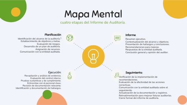Resumen ejecutivo. Contextualización del alcance y objetivos. Presentación de hallazgos y conclusiones. Recomendaciones para mejoras. Respuestas de la entidad auditada. Conclusión general y opinión del auditor.