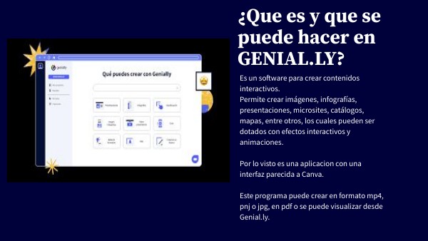 Es un software para crear contenidos interactivos. Permite crear imágenes, infografías, presentaciones, microsites, catálogos, mapas, entre otros, los cuales pueden ser dotados con efectos interactivos y animaciones. Por lo visto es una aplicacion con una interfaz parecida a Canva. Este programa puede crear en formato mp4, pnj o jpg, en pdf o se puede visualizar desde Genial.ly.