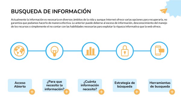 Actualmente la información es necesaria en diversos ámbitos de la vida y aunque Internet ofrece varias opciones para recuperarla, no garantiza que podamos hacerlo de manera efectiva. Lo anterior puede deberse al exceso de información, desconocimiento del manejo de los recursos o simplemente el no contar con las habilidades necesarias para explotar la riqueza informativa que la web ofrece.
