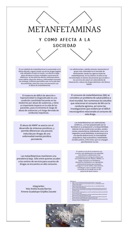 Las metanfetaminas son estimulantes sintéticos, y se han popularizado por la facilidad en su preparación y la disponibilidad, Además de las condiciones sociales, existen ciertas características individuales como una raigambre social debilitada, la pertenencia a una familia disfuncional, la comorbilidad psiquiátrica, baja autoestima y habilidades sociales pobres, entre otras, que se conjugan para favorecer su uso.