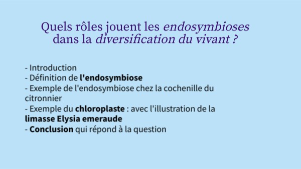 - Introduction - Définition de l'endosymbiose - Exemple de l'endosymbiose chez la cochenille du citronnier - Exemple du chloroplaste : avec l'illustration de la limace Elysia emeraude - Conclusion qui répond à la question