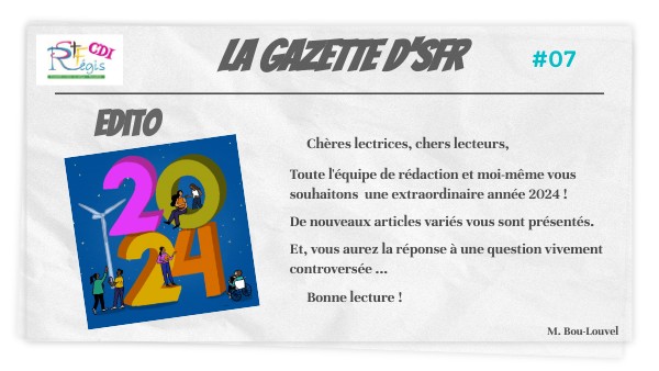 Merci d'avoir lu ce septième numéro de la Gazette'SFR !Votre avis nous intéresse, alors n'hésitez pas à nous faire un retour ou à nous faire part de vos suggestions en venant directement au CDI.