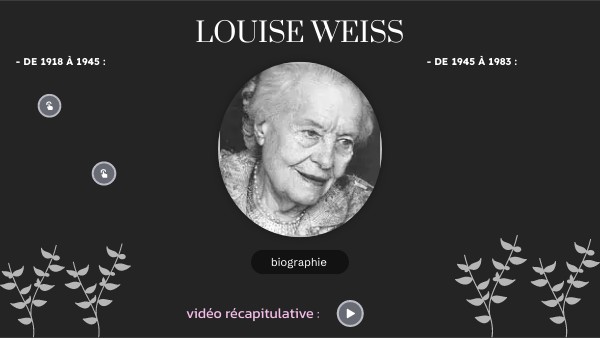 BIOGRAPHIE Louise Weiss est née en 1893 à Arras et est morte en 1983 à l'âge de 90ans. Elle est née d'une famille bourgeoise. C'était une journaliste, qui était féministe et résistante des l'âge de ses 25ans.