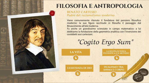 Viene comunemente ritenuto il fondatore del pensiero filosofico moderno: la sua figura racchiude in filosofia il passaggio dal Rinascimento all’età moderna. Fu anche un grandissimo scienziato in campo matematico: a lui dobbiamo la fondazione della geometria analitica con l’invenzione dei cosiddetti assi cartesiani.