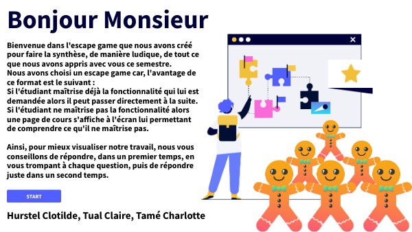 Bienvenue dans l'escape game que nous avons créé pour faire la synthèse, de manière ludique, de tout ce que nous avons appris avec vous ce semestre. Nous avons choisi un escape game car, l'avantage de ce format est le suivant : Si l'étudiant maîtrise déjà la fonctionnalité qui lui est demandée alors il peut passer directement à la suite. Si l'étudiant ne maîtrise pas la fonctionnalité alors une page de cours s'affiche à l'écran lui permettant de comprendre ce qu'il ne maîtrise pas. Ainsi, pour mieux visualiser notre travail, nous vous conseillons de répondre, dans un premier temps, en vous trompant à chaque question, puis de répondre juste dans un second temps.