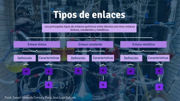 Los principales tipos de enlaces químicos entre átomos son tres: enlaces iónicos, covalentes y metálicos.