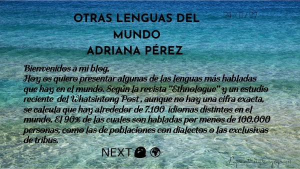 En este blog he aprendido cuántas lenguas hay en el mundo y no sabía, que eran tantas, cada una con su historia, ni cual era su orden de importancia y que hay países con un sólo idioma oficail y otros en los que hay más de uno, También he aprendido que dentro de las diferentes lenguas hay muchas personas que hablan dialectos, Otra cosa importante es que las lenguas a parte de servir para comunicar, están relacionadas con la cultura y las personas que lo hablan en cada sitio.Espero que os haya gustado mucho y que os llame la atención la importancia de las diferentes lenguas , a mí me ha encantado el escribir este blog . ADRIANA PEREZ