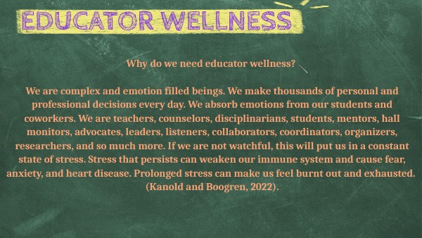 Why do we need educator wellness? We are complex and emotion filled beings. We make thousands of personal and professional decisions every day. We absorb emotions from our students and coworkers. We are teachers, counselors, disciplinarians, students, mentors, hall monitors, advocates, leaders, listeners, collaborators, coordinators, organizers, researchers, and so much more. If we are not watchful, this will put us in a constant state of stress. Stress that persists can weaken our immune system and cause fear, anxiety, and heart disease. Prolonged stress can make us feel burnt out and exhausted. (Kanold and Boogren, 2022).