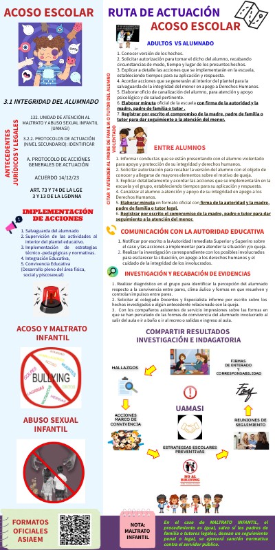 1. Informar conductas que se están presentando con el alumno violentado para apoyo y protección de su integridad y derechos humanos. 2. Solicitar autorización para recabar la versión del alumno con el objeto de conocer y allegarse de mayores elementos sobre el motivo de queja. 3. Explicar detalladamente y acordar las acciones que se implementarán en la escuela y el grupo, estableciendo tiempos para su aplicación y respuesta. 4. Canalizar al alumno a atención y apoyo de su integridad en apego a los Derechos Humanos. 5. Elaborar minuta en formato oficial con firma de la autoridad y la madre, padre de familia o tutor legal. 6. Registrar por escrito el compromiso de la madre, padre o tutor para dar seguimiento a la atención del menor.