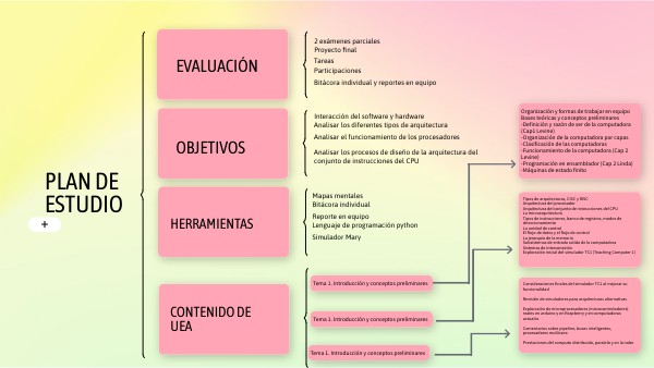 Tipos de arquitecturas, CISC y RISC Arquitectura del procesador Arquitectura del conjunto de instrucciones del CPU La microarquitectura Tipos de instrucciones, banco de registros, modos de direccionamiento La unidad de control El flujo de datos y el flujo de control La jerarquía de la memoria Subsistemas de entrada salida de la computadora Sistemas de interconexión Exploración inicial del simulador TC1 (Teaching Computer 1)