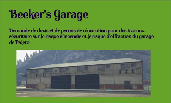 Demande de devis et de permis de rénovation pour des travaux sécuritaire sur le risque d'incendie et le risque d'effraction du garage de Paleto