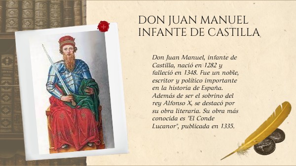 Don Juan Manuel, infante de Castilla, nació en 1282 y falleció en 1348. Fue un noble, escritor y político importante en la historia de España. Además de ser el sobrino del rey Alfonso X, se destacó por su obra literaria. Su obra más conocida es "El Conde Lucanor", publicada en 1335.