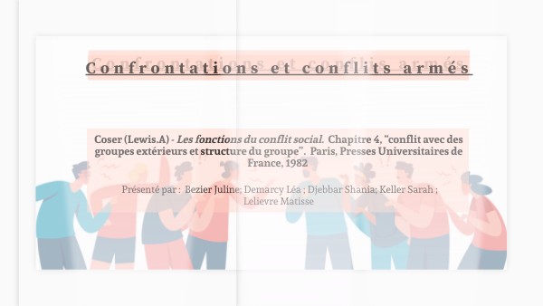 - Chapitre 4 “conflit avec des groupes extérieurs et structure du groupe” : montre que le conflit social bien qu’il puisse avoir des effets néfastes a pour fonction d’établir et de maintenir la cohésion, l’identité et les limites des sociétés et groupes.