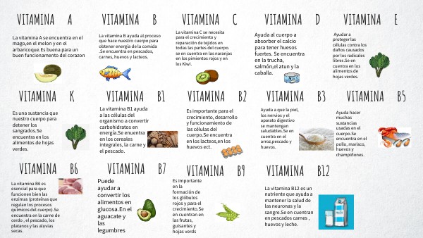 La vitamina B ayuda al proceso que hace nuestro cuerpo para obtener energía de la comida .Se encuentra en pescados, carnes, huevos y lacteos.