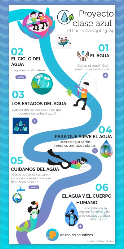 Proyecto: EL AGUA En el 3º trimestre realizamos un proyecto sobre «El agua», como ya sabéis, con el alumnado de 4 años. A continuación, os presento el índice de contenidos con el que vamos a aprender la importancia del agua en nuestros días: CONTENIDOS 1. Estados y propiedades del agua (flotación, mezclas…) 2. El ciclo del agua 3. Dónde encontramos el agua 4. Importancia del agua: en el cuerpo y en el mundo 5. Usos del agua 6. Cuidamos el planeta: ahorramos agua