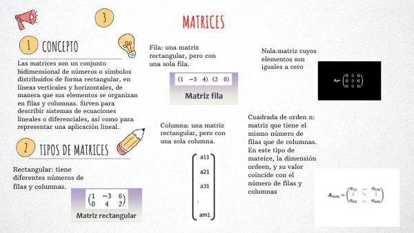 Las matrices son un conjunto bidimensional de números o símbolos distribuidos de forma rectangular, en líneas verticales y horizontales, de manera que sus elementos se organizan en filas y columnas. Sirven para describir sistemas de ecuaciones lineales o diferenciales, así como para representar una aplicación lineal.