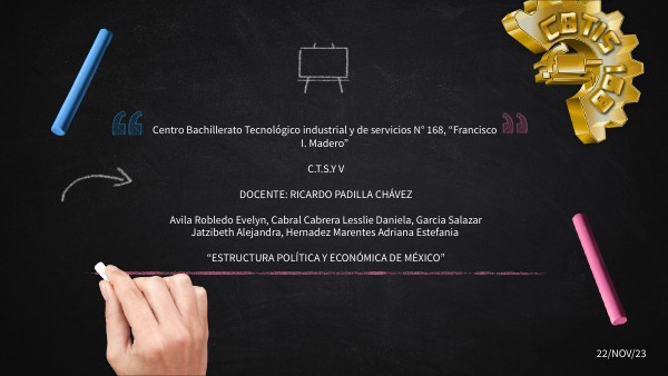 Centro Bachillerato Tecnológico industrial y de servicios N° 168, “Francisco I. Madero” C.T.S.Y V DOCENTE: RICARDO PADILLA CHÁVEZ Avila Robledo Evelyn, Cabral Cabrera Lesslie Daniela, Garcia Salazar Jatzibeth Alejandra, Hernadez Marentes Adriana Estefania “ESTRUCTURA POLÍTICA Y ECONÓMICA DE MÉXICO”