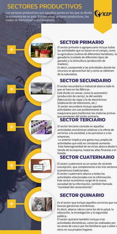 Los sectores productivos son aquellas partes en las que se divide la economía de un país. Existen cinco sectores productivos, los cuales se mencionan a continuación.