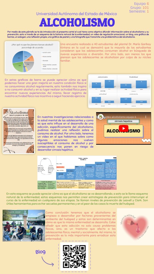 Por medio de este párrafo se te da introducción al presente cartel el cual tiene como objetivo difundir información sobre el alcoholismo y su prevención, esto a través de un esquema de la historia natural de la enfermedad, un video de regulación emocional, un blog, una gráfica de barras, un eslogan, una reflexión propia, una gráfica de pastel y una fotografía que transmite una problemática del alcoholismo.