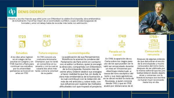 Filósofo y escritor francés que editó junto con D'Alembert la célebre Enciclopedia, obra emblemática de la Ilustración. Fue el hijo mayor de un acomodado cuchillero, cuyas virtudes burguesas de honradez y amor al trabajo había de recordar más tarde con admiración.