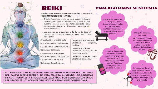 - El reiki funciona a traves de centros energéticos o chakras. Los chakras administran la energía de nuestro cuerpo pero su funcionamiento está fuertemente ligado a diferentes aspectos de nuestra conducta.