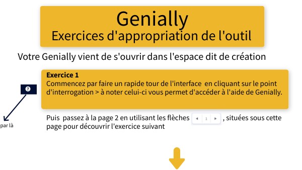 Exercice 1 Commencez par faire un rapide tour de l'interface en cliquant sur le point d'interrogation > à noter celui-ci vous permet d'accéder à l'aide de Genially. Puis passez à la page 2 en utilisant les flèches , situées sous cette page pour découvrir l'exercice suivant