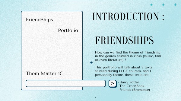 How can we find the theme of friendship in the genres studied in class (music, film or even literature) ? This portfolio will talk about 3 texts studied during LLCE courses, and 1 personnaly theme, these texts are ; -Harry Potter -The GreenBook -Friends (Bromance) -