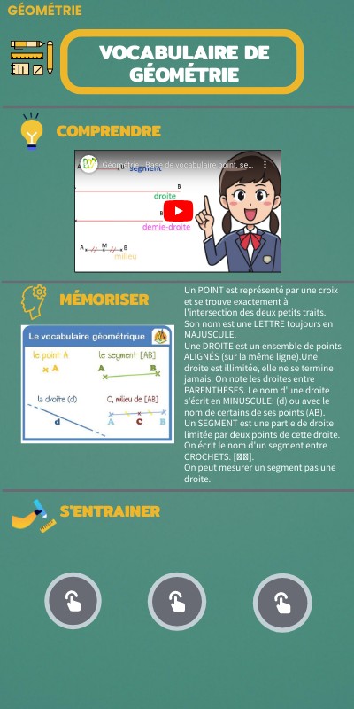 Un POINT est représenté par une croix et se trouve exactement à l'intersection des deux petits traits. Son nom est une LETTRE toujours en MAJUSCULE. Une DROITE est un ensemble de points ALIGNÉS (sur la même ligne).Une droite est illimitée, elle ne se termine jamais. On note les droites entre PARENTHÈSES. Le nom d'une droite s'écrit en MINUSCULE: (d) ou avec le nom de certains de ses points (AB). Un SEGMENT est une partie de droite limitée par deux points de cette droite. On écrit le nom d'un segment entre CROCHETS: [𝖠𝖡]. On peut mesurer un segment pas une droite.